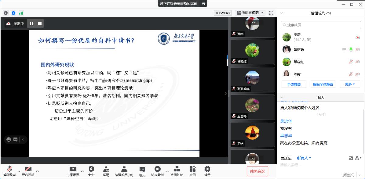 10月27日下午,中出 举办“关于国自科青年基金申请”交流会,邀请北京交通大学经管学院童丽静博士进行讲座,讲座采取腾讯会议形式召开,中出 部分教师和研究生参加了会议。